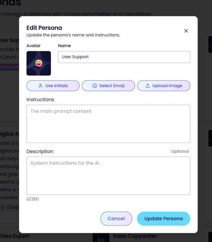 The pop-up presented will then allow you to edit your Persona's name and instructions;