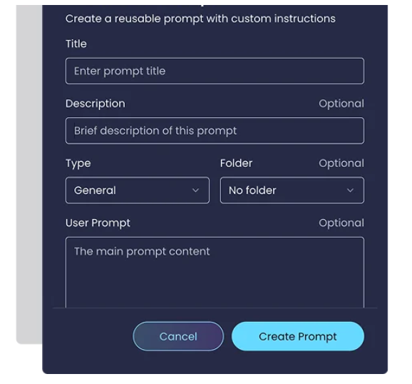 Next click ‘+New Prompt’ button to open the Create New Prompt pop up and simply fill in the boxes with your prompt details;