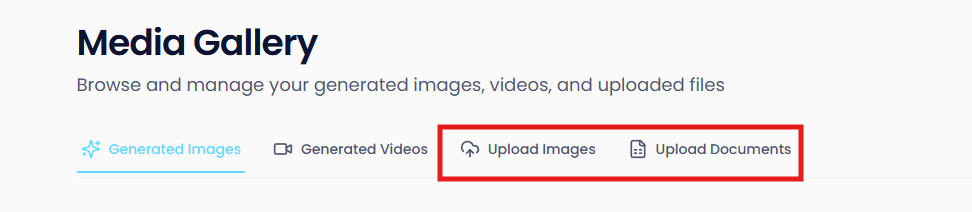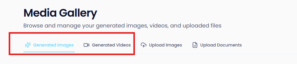 Instead of searching through your Images or Videos sections separately, the Media Gallery offers a single, central place to browse and manage all your generated images, videos, and uploaded files.